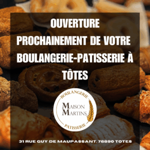 Située à Tôtes, notre boulangerie artisanale Maison Martins prépare chaque jour pains, viennoiseries et pâtisseries fraîches, avec des farines françaises issues de moulins locaux